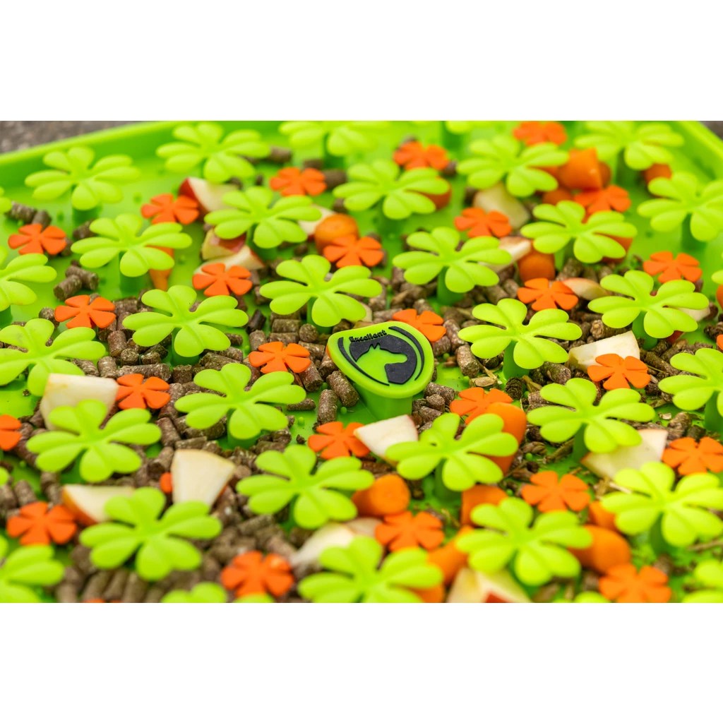 Legen Sie die Schnüffelmatte auf eine ebene Fläche (z. B. im Stall, im Anhänger oder auf dem Paddock) und füllen Sie sie mit Leckereien wie Raufutter, Pellets, Müsli oder Obst- und Gemüsestücken. Nach dem Gebrauch kann die Matte dank des Lochs in der Ecke einfach aufgehängt werden (z. B. mit einem Karabiner), damit sie abgespült und an der Luft getrocknet werden kann.